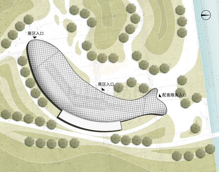 结构受力件与建筑赋形融合考虑,将美学趣味和建构观念的矛盾藏匿在了作品的建成效果中。展馆立面肌理与结构形式结合,形成交错的井字型框架,其间填充ETFE膜作为建筑的外围护。根据网壳结构的特点,表皮被划分成约16㎡/个的许多菱形单元,ETFE膜气枕单元和玻璃单元依建筑功能交错布置,立面上形成有趣的肌理变化。
