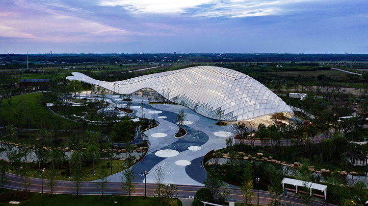 ETFE膜作为项目外围护的主要材料,记叙着如今仪征市高歌猛进的时代性;柔韧的造型,阳光照射下的漫反射光感不难让人联想到“江豚时出戏,惊波忽荡漾”的场景。