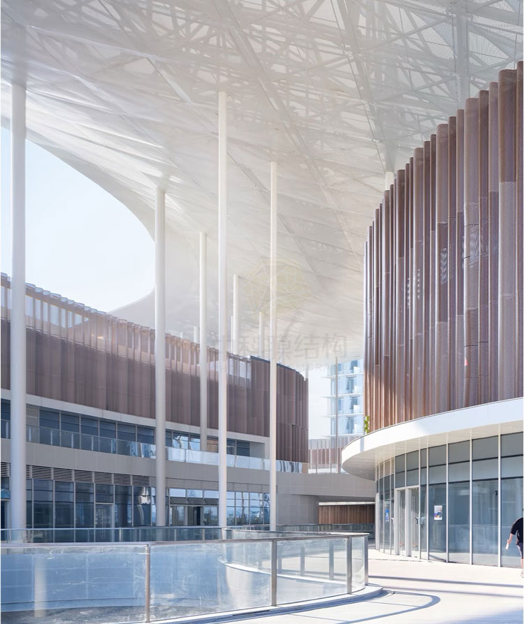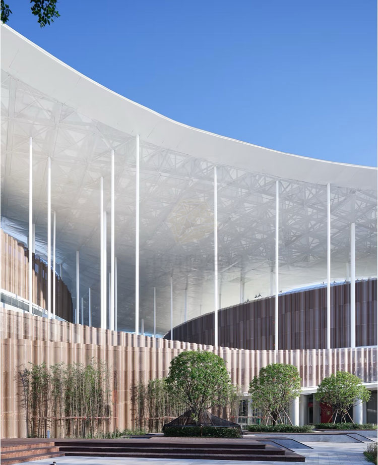 杭州亚运会棒垒球体育文化中心就是著名的宝藏膜建筑,屋面采用双向桁架结构系统,覆盖带二氧化钛涂层的PTFE膜结构,每块单元中间微微隆起,形似水波,隐喻绍兴水乡特色,天光透过膜屋面漫射于场馆,营造出丰富的光影层次。